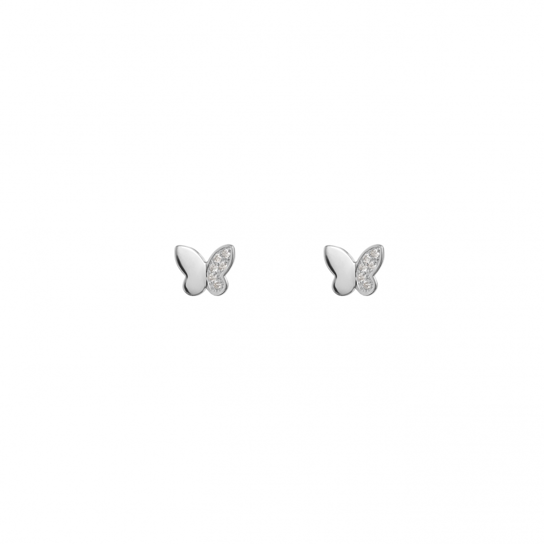 Cercei fluture,cu o aripă netedă și una pavată cu cristale de zircon. Sunt realizați din argint placat cu rodiu sau aur galben de 14K.